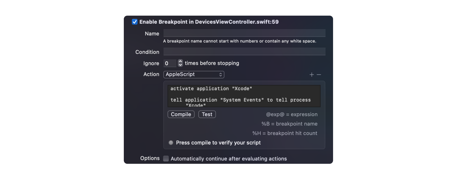 Now that we have the worked script, need to find a way to invoke it right from Xcode. The handy thing you may not have heard, it’s the ability to invoke an apple script right from a breakpoint: (Right-click on any breakpoint) > Edit breakpoint > Add Action > Chouse ‘Apple Script’ from dropdown > (paste our script):